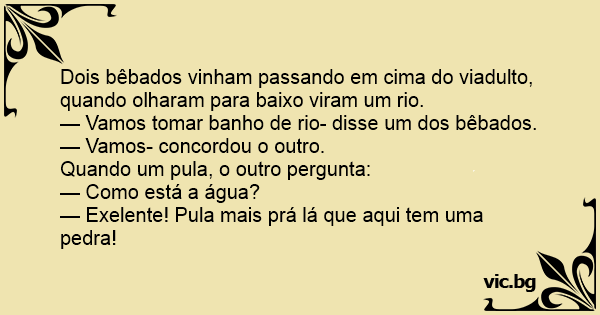Dois bêbados vinham passando em cima do viadulto, quando olharam para baixo viram um rio.