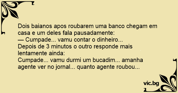 Dois baianos apos roubarem uma banco chegam em casa e um deles fala pausadamente: