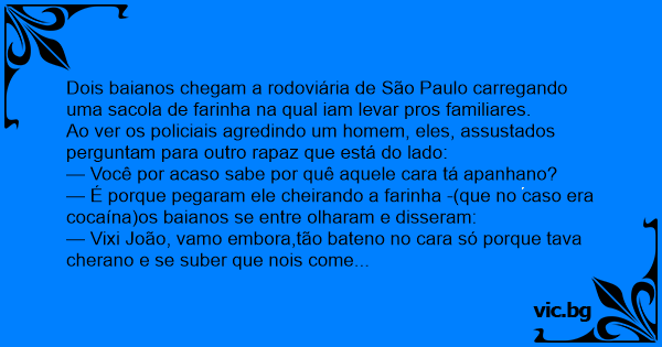— É porque pegaram ele cheirando a farinha -(que no caso era cocaína)os baianos se entre olharam e disseram: