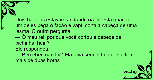 Dois baianos estavam andando na floresta quando um deles pega o facão e vapt, corta a cabeça de uma lesma. O outro pergunta: