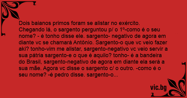 Chegando lá, o sargento perguntou p/ o 1º-como é o seu nome? - é tonho disse ele. sargento- negativo de agora em diante vc se chamará Antônio. Sargento-o que vc veio fazer aki? tonho-vim me alistar, sargento-negativo vc veio servir a sua pátria sargento-e o que é aquilo? tonho- é a bandeira do Brasil, sargento-negativo de agora em diante ela será a sua mãe. Agora vc disse o sargento c/ o outro. -como é o seu nome? -é pedro disse. sargento-o que vc veio fazer aki? -vim servir a pátria disse. sargento- e o que é aquilo? -é a minha tia mãe do tonho.