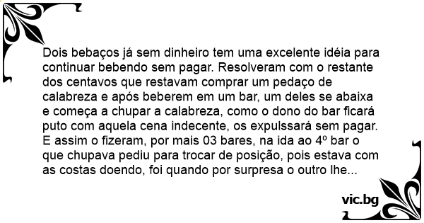 Dois bebaços já sem dinheiro tem uma excelente idéia para continuar bebendo sem pagar. Resolveram com o restante dos centavos que restavam comprar um pedaço de calabreza e após beberem em um bar, um deles se abaixa e começa a сhuраr a calabreza, como o dono do bar ficará рuто com aquela cena indecente, os expulssará sem pagar. E assim o fizeram, por mais 03 bares, na ida ao 4º bar o que chupava pediu para trocar de posição, pois estava com as costas doendo, foi quando por surpresa o outro lhe falou que a calabreza já havia caído no primeiro bar.