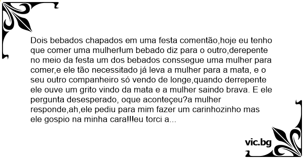 Dois bebados chapados em uma festa comentão,hoje eu tenho que comer uma mulher!um bebado diz para o outro,derepente no meio da festa um dos bebados conssegue uma mulher para comer,e ele tão necessitado já leva a mulher para a mata, e o seu outro companheiro só vendo de longe,quando derrepente ele ouve um grito vindo da mata e a mulher saindo brava. E ele pergunta desesperado, oque aconteçeu?a mulher responde,ah,ele pediu para mim fazer um carinhozinho mas ele gospio na minha cara!!!eu torci a cabeça dele quebrei os dois ôvinhos e soquei fogo no ninho!.