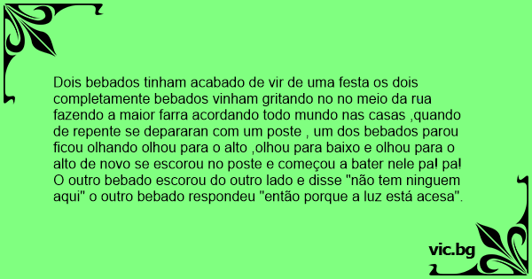 Dois bebados tinham acabado de vir de uma festa os dois completamente bebados vinham gritando no no meio da rua fazendo a maior farra acordando todo mundo nas casas ,quando de repente se depararan com um poste , um dos bebados parou ficou olhando olhou para o alto ,olhou para baixo e olhou para o alto de novo se escorou no poste e começou a bater nele pa! pa!