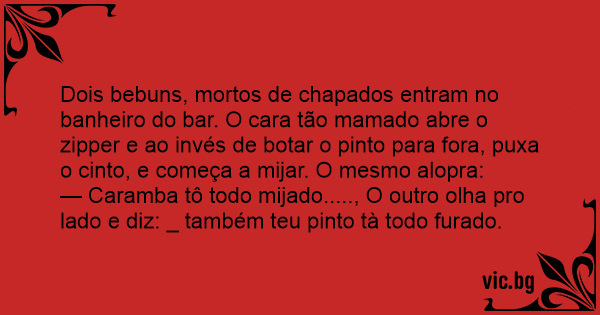 Dois bebuns, mortos de chapados entram no banheiro do bar. O cara tão mamado abre o zipper e ao invés de botar o pinto para fora, puxa o cinto, e começa a mijar. O mesmo alopra: