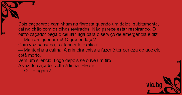 Dois caçadores caminham pela mata, quando um deles desmaia. Parece que não respira e seus olhos não se movem. Seu companheiro liga para o serviço de emergência pelo celular. — - Meu amigo morreu! O...