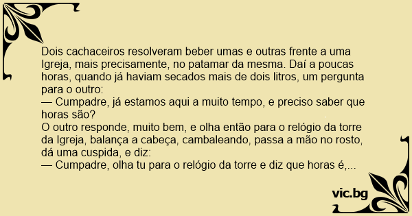 — Cumpadre, olha tu para o relógio da torre e diz que horas é, pois, não estou vendo mais nem os ponteiros.