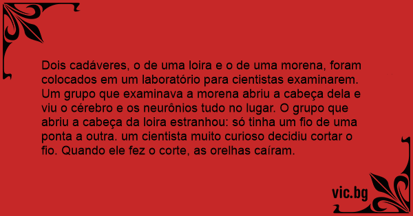 Um grupo que examinava a morena abriu a cabeça dela e viu o cérebro e os neurônios tudo no lugar. O grupo que abriu a cabeça da loira estranhou: só tinha um fio de uma ponta a outra. um cientista muito curioso decidiu cortar o fio. Quando ele fez o corte, as orelhas caíram.