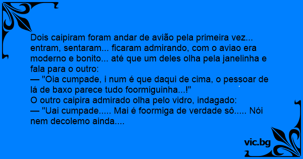 Dois caipiram foram andar de avião pela primeira vez... entram, sentaram... ficaram admirando, com o aviao era moderno e bonito... até que um deles olha pela janelinha e fala para o outro:
