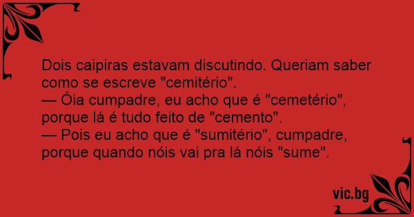 — Pois eu acho que é "sumitério", cumpadre, porque quando nóis vai pra lá nóis "sume".