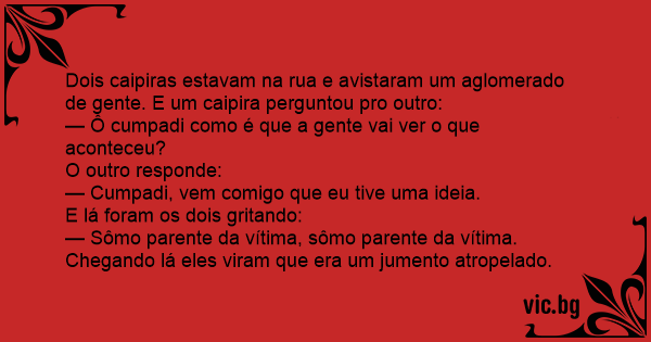 Dois caipiras estavam na rua e avistaram um aglomerado de gente. E um caipira perguntou pro outro: