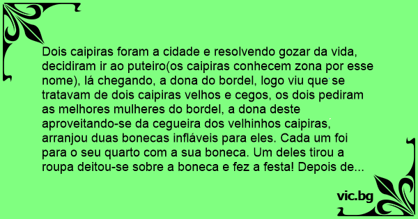 Dois caipiras foram a cidade e resolvendo gozar da vida, decidiram ir ao puteiro(os caipiras conhecem zona por esse nome), lá chegando, a dona do bordel, logo viu que se tratavam de dois caipiras velhos e cegos, os dois pediram as melhores mulheres do bordel, a dona deste aproveitando-se da cegueira dos velhinhos caipiras, arranjou duas bonecas infláveis para eles. Cada um foi para o seu quarto com a sua boneca. Um deles tirou a roupa deitou-se sobre a boneca e fez a festa! Depois de cansado(2 minutos no máximo!) o caipira olhou para a boneca e disse: