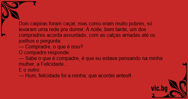 Dois caipiras foram caçar, mas como eram muito pobres, só levaram uma rede pra dormir. À noite, bem tarde, um dos compradres acorda assustado, com as calças arriadas até os joelhos e pergunta: