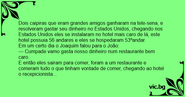 Dois caipiras que eram grandes amigos ganharam na tele-sena, e resolveram gastar seu dinheiro no Estados Unidos, chegando nos Estados Unidos eles se instalaram no hotel mais caro de lá, este hotel possuia 56 andares e eles se hospedaram 53ºandar.