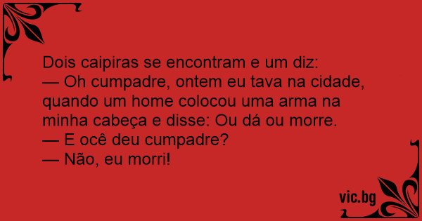 — Oh cumpadre, ontem eu tava na cidade, quando um home colocou uma arma na minha cabeça e disse: Ou dá ou morre.