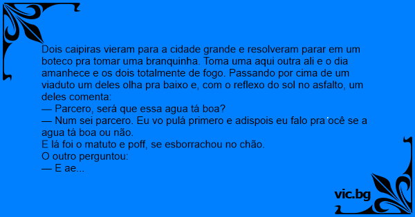 Dois caipiras vieram para a cidade grande e resolveram parar em um boteco pra tomar uma branquinha. Toma uma aqui outra ali e o dia amanhece e os dois totalmente de fogo. Passando por cima de um viaduto um deles olha pra baixo e, com o reflexo do sol no asfalto, um deles comenta: