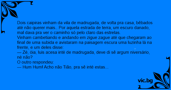 Dois caipiras vinham da vila de madrugada, de volta pra casa, bêbados até não querer mais.. Por aquela estrada de terra, um escuro danado, mal dava pra ver o caminho só pelo claro das estrelas.