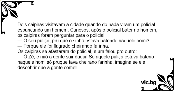 Dois caipiras visitavam a cidade quando do nada viram um policial espancando um homem. Curiosos, após o policial bater no homem, os caipiras foram perguntar para o policial.