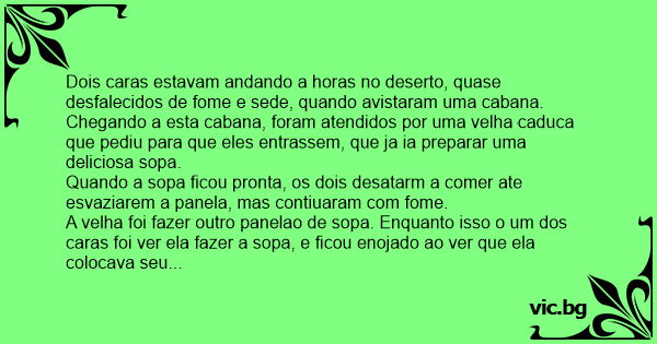 Quando se juntou ao segundo cara, este ja havia comido metade da panela, e satisfeito, agradeceu a velha, e ja iam saindo quando a velha deu por falta do bacon, e exclamou -Sumiu o meu bacon que eu passo na bunda para aliviar minhas hemorroidas.