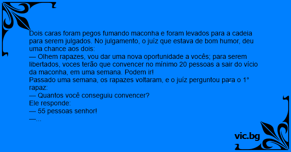 Dois caras foram pegos fumando maconha e foram levados para a cadeia para serem julgados. No julgamento, o juíz que estava de bom humor, deu uma chance aos dois: