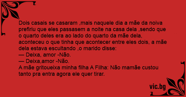 Dois casais se casaram ,mais naquele dia a mãe da noiva prefiriu que eles passasem a noite na casa dela ,sendo que o quarto deles era ao lado do quarto da mãe dela, aconteceu o que tinha que acontecer entre eles dois, a mãe dela estava escultando ,o marido disse: