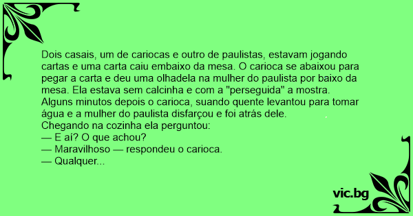 Dois casais, um de cariocas e outro de paulistas, estavam jogando cartas e uma carta caiu embaixo da mesa. O carioca se abaixou para pegar a carta e deu uma olhadela na mulher do paulista por baixo da mesa. Ela estava sem calcinha e com a "perseguida" a mostra.