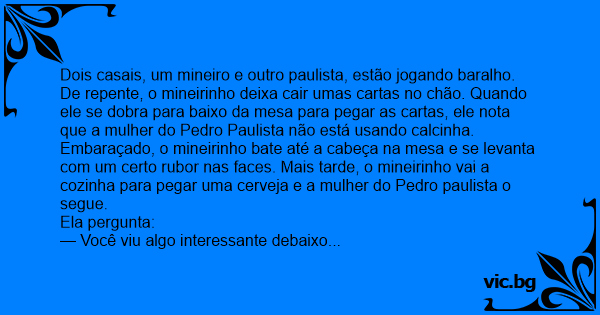 De repente, o mineirinho deixa cair umas cartas no chão. Quando ele se dobra para baixo da mesa para pegar as cartas, ele nota que a mulher do Pedro Paulista não está usando calcinha. Embaraçado, o mineirinho bate até a cabeça na mesa e se levanta com um certo rubor nas faces. Mais tarde, o mineirinho vai a cozinha para pegar uma cerveja e a mulher do Pedro paulista o segue.