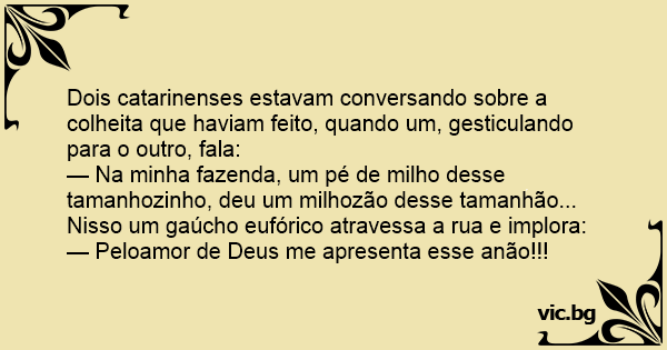 Dois catarinenses estavam conversando sobre a colheita que haviam feito, quando um, gesticulando para o outro, fala: