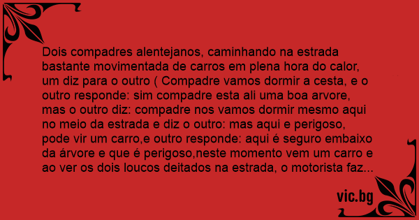 Dois compadres alentejanos, caminhando na estrada bastante movimentada de carros em plena hоrа do calor, um diz para o outro ( Compadre vamos dormir a cesta, e o outro responde: sim compadre esta ali uma boa arvore, mas o outro diz: compadre nos vamos dormir mesmo aqui no meio da estrada e diz o outro: mas aqui e perigoso, pode vir um carro,e outro responde: aqui é seguro embaixo da árvore e que é perigoso,neste momento vem um carro e ao ver os dois loucos deitados na estrada, o motorista faz uma manobra brusca e vai bater com o carro na árvore, aí diz um alentejano para o outro: Estas a ver compadre que se estivessemos embaixo da árvore já estariamos mortos.)