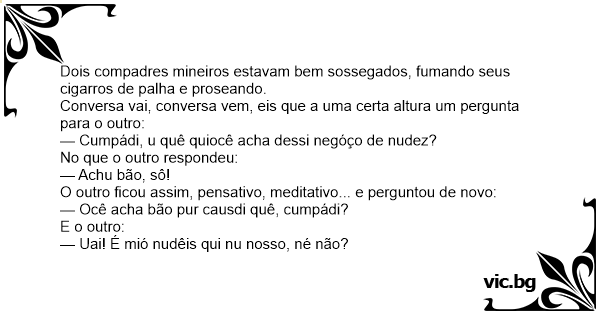 — Cumpádi, u quê quiocê acha dessi negóço de nudez?