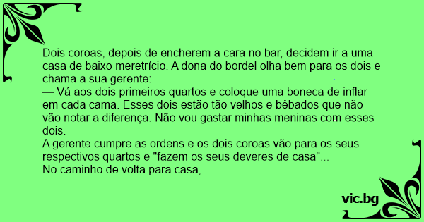 Dois coroas, depois de encherem a cara no bar, decidem ir a uma casa de baixo meretrício. A dona do bordel olha bem para os dois e chama a sua gerente: