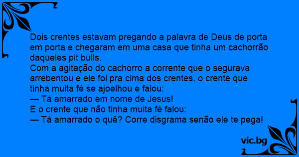 Dois crentes estavam pregando a palavra de Deus de porta em porta e chegaram em uma casa que tinha um cachorrão daqueles pit bulls.