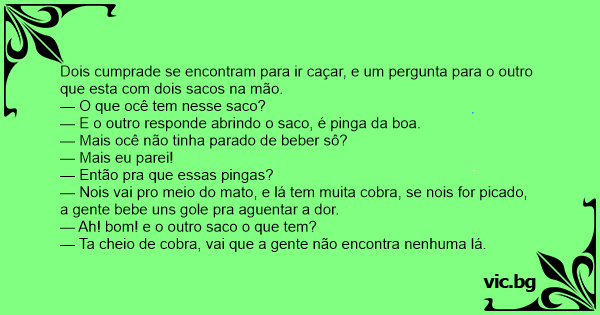 — E o outro responde abrindo o saco, é pinga da boa.