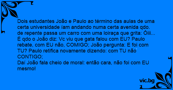 Dois estudantes João e Paulo ao término das aulas de uma certa universidade íam andando numa certa avenida qdo. de repente passa um carro com uma loiraça que grita: Ôiii... É qdo o João diz: Vc viu que gata falou com EU? Paulo rebate, com EU não, COMIGO; João pergunta: E foi com TU? Paulo retifica novamente dizendo: com TU não CONTIGO;