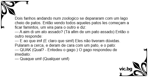 Dois fanhos andando num zoologico se depararam com um lago cheio de patos. Então vendo todos aqueles patos les começam a ficar famintos, um vira para o outro e diz: