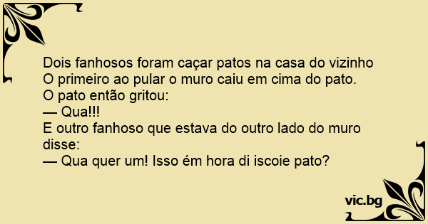Dois fanhosos foram caçar patos na casa do vizinho O primeiro ao pular o muro caiu em cima do pato.
