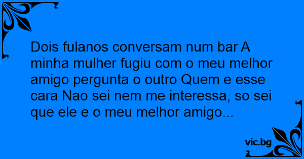 Dois fulanos conversam num bar A minha mulher fugiu com o meu melhor amigo pergunta o outro Quem e esse cara Nao sei nem me interessa, so sei que ele e o meu melhor amigo...