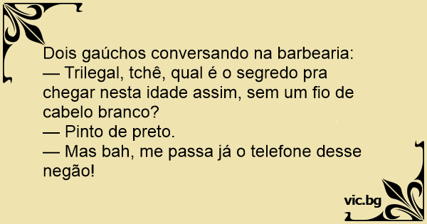 — Trilegal, tchê, qual é o segredo pra chegar nesta idade assim, sem um fio de cabelo branco?