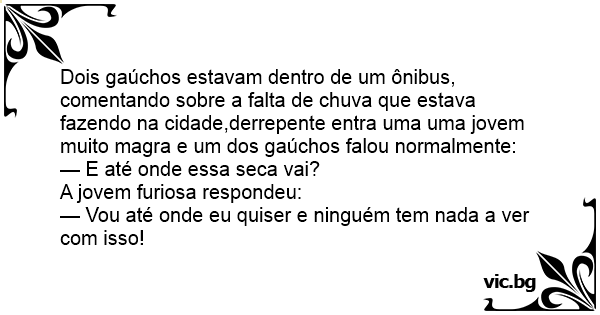 Dois gaúchos estavam dentro de um ônibus, comentando sobre a falta de chuva que estava fazendo na cidade,derrepente entra uma uma jovem muito magra e um dos gaúchos falou normalmente:
