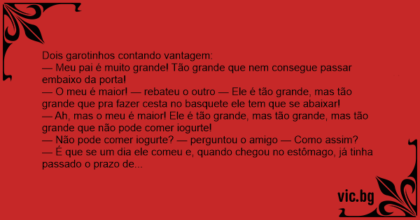 — O meu é maior! — rebateu o outro — Ele é tão grande, mas tão grande que pra fazer cesta no basquete ele tem que se abaixar!