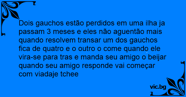 Dois gauchos estão perdidos em uma ilha ja passam 3 meses e eles não aguentão mais quando resolvem transar um dos gauchos fiса de quatro e o outro o come quando ele vira-se para tras e manda seu amigo o beijar quando seu amigo responde vai começar com viadaje tchee