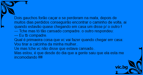 Dois gauchos forão caçar e se perderam na mata, depois de muitos dias perdidos conseguirão encontrar o caminho de volta, ai quando estavão quase chegando em casa um disse p/ o outro !