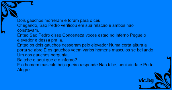 Entao os dois gauchos desseram pelo elevador Numa certa altura a porta se abre E os gauchos veem varios homens masculos se beijando Um dos gauchos pergunta.