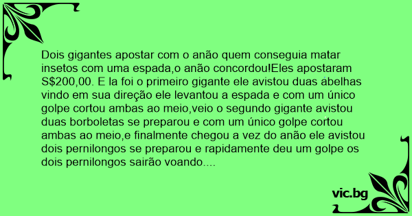 Dois gigantes apostar com o anão quem conseguia matar insetos com uma espada,o anão concordou!Eles apostaram S$200,00. E la foi o primeiro gigante ele avistou duas abelhas vindo em sua direção ele levantou a espada e com um único golpe cortou ambas ao meio,veio o segundo gigante avistou duas borboletas se preparou e com um único golpe cortou ambas ao meio,e finalmente chegou a vez do anão ele avistou dois pernilongos se preparou e rapidamente deu um golpe os dois pernilongos sairão voando.
