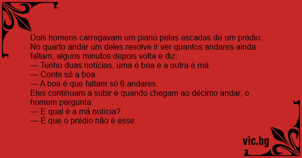 Du vyrai į devintą aukštą neša sunkią spintą. Vienas jų sako kitam: - Eik pažiūrėk kiek aukštų liko. Tas pažiūrėjęs sako: - Turiu gerą ir blogą žinią. - Pirmiau sakyk gerą. - Mums beliko du...
