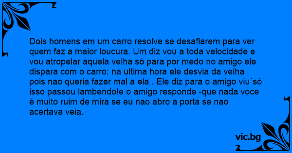 Dois homens em um carro resolve se desafiarem para ver quem faz a maior loucura. Um diz vou a toda velocidade e vou atropelar aquela velha só para por medo no amigo ele dispara com o carro; na ultima hоrа ele desvia da velha pois nao queria fazer mal a ela . Ele diz para o amigo viu´só isso passou lambendo!e o amigo responde -que nada voce é muito ruim de mira se eu nao abro a porta se nao acertava veia.