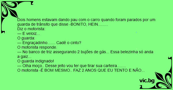Dois homens estavam dando раu com o carro quando foram parados por um guarda de trânsito que disse -BONITO, HEIN.........