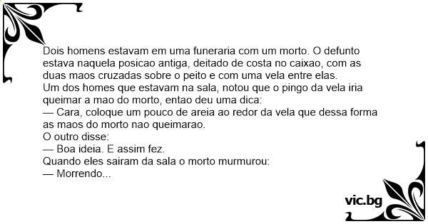 Dois homens estavam em uma funeraria com um morto. O defunto estava naquela posicao antiga, deitado de costa no caixao, com as duas maos cruzadas sobre o peito e com uma vela entre elas.