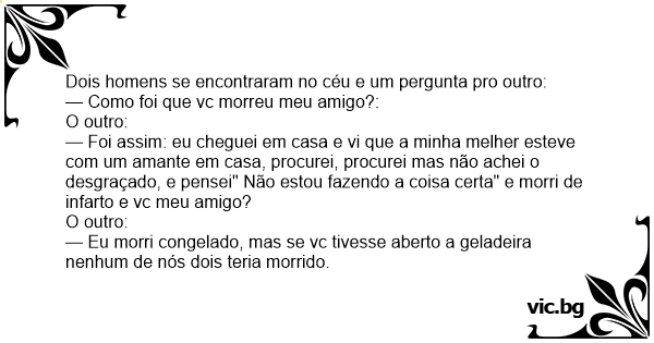 — Foi assim: eu cheguei em casa e vi que a minha melher esteve com um amante em casa, procurei, procurei mas não achei o desgraçado, e pensei" Não estou fazendo a coisa certa" e morri de infarto e vc meu amigo?