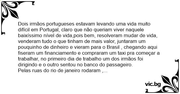 Dois irmãos portugueses estavam levando uma vida muito difícil em Portugal, claro que não queriam viver naquele baixíssimo nível de vida,pois bem, resolveram mudar de vida, venderam tudo o que tinham de mais valor, juntaram um pouquinho de dinheiro e vieram para o Brasil , chegando aqui fiseram um financiamento e compraram um taxi pra começar a trabalhar, no primeiro dia de trabalho um dos irmãos foi dirigindo e o outro sentou no banco do passageiro.